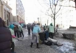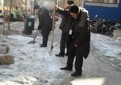 保洁人员在捡拾垃圾 物业管家在铲除硬冰